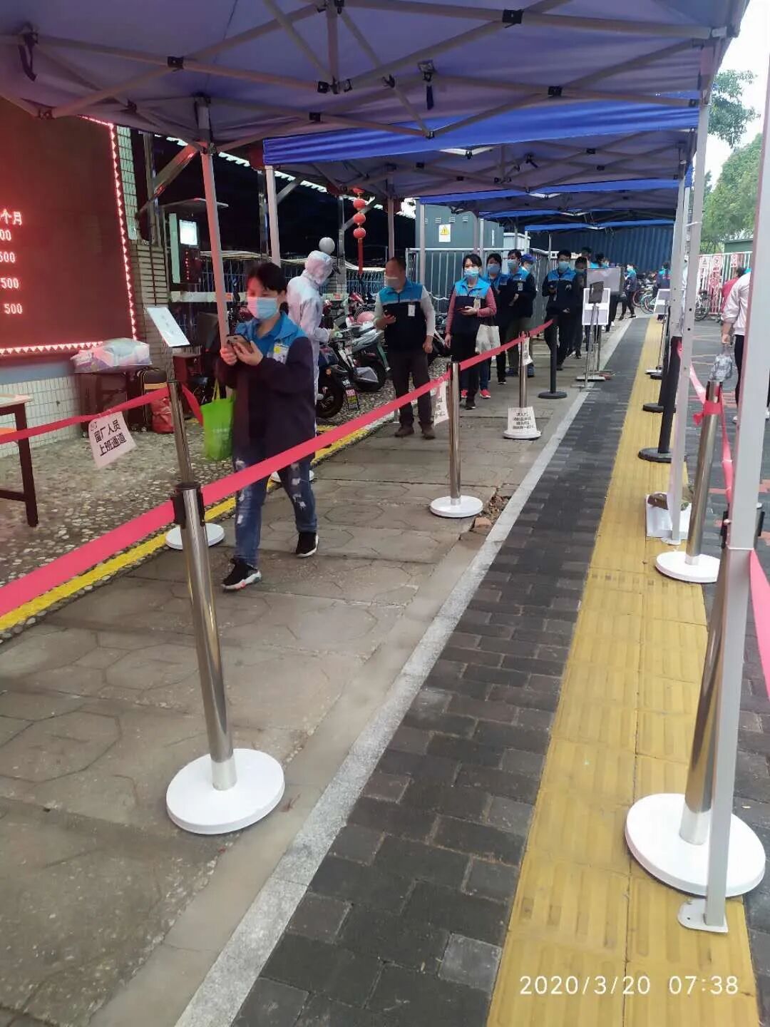 进厂前,要排队;进饭堂,要排队;进宿舍,要排队;下班出厂,还要排队。排队不是最主要的,最主要的是要保持一米半到两米以上的距离。不聚集,不扎堆,保持距离,这个时候,距离不止产生美,更产生安全和关爱。